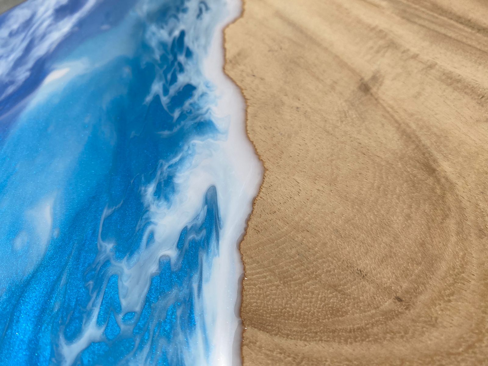 Tabla para picar alimentos en madera y epoxy,la cual sirve también como porta calientes.  De fácil manipulación.